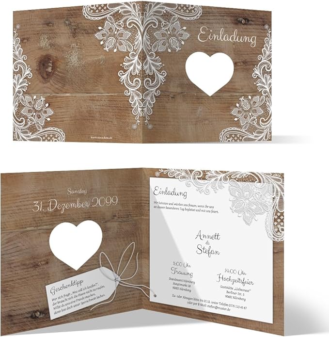Das Besondere an dem Motiv "Rustikal" ist das ausgestanzte Herz auf der Außenseite. Damit sieht man die Namen auf der Innenseite, die in der Mitte gedruckt sind, selbst wenn es zugeklappt ist.